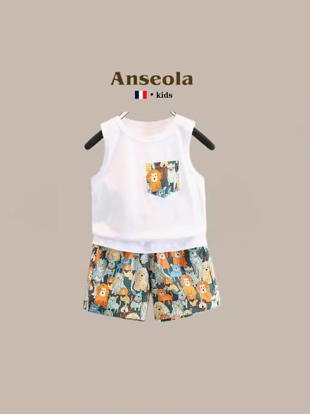ANSEOLA Boys Summer Short-sleeved Suit Cartoon Children Fashionable Boy Baby Cool Summer Shirt Three-piece Suit
